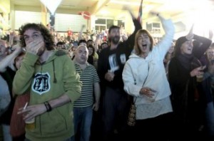 Simpatizantes de Bildu celebran los resultados electorales obtenidos por la coalición, durante el acto que celebran esta noche en el frontón Atano de San Sebastián.