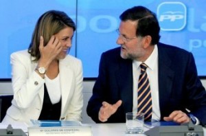 El presidente del PP, Mariano Rajoy, conversa con la secretaria general, María Dolores de Cospedal, durante la reunión del Comité Ejecutivo del PP que se celebra esta tarde en su sede de Madrid.