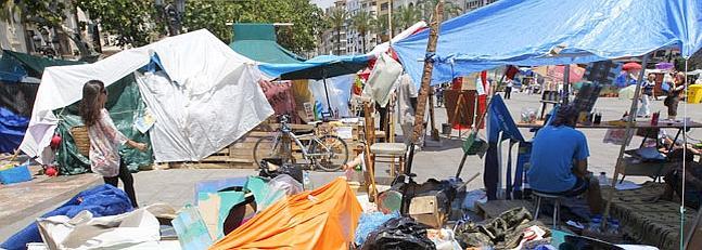 Vista de la acampada, ayer, con caóticas tiendas y enseres en la plaza del Ayuntamiento de Valencia.