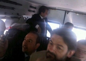 Representantes de distintos grupos políticos apelotonados en una furgoneta. Oriol Pujol, de CiU, parece sentado encima del líder de Ciudadanos, Albert Rivera. A un lado Ramon Espadaler, también de CiU, y al fondo, de pie, el expresidente del FC Barcelona, Joan Laporta.