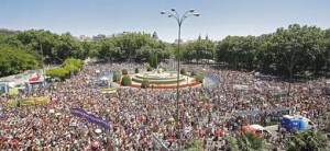 Las seis columnas de manifestantes (#19jmani) del movimiento 15-M ((#15M) que han recorrido Madrid desde las nueve de la mañana se han unido en la plaza de Neptuno, en los aledaños del Congreso de los Diputados, en un ambiente festivo y pacífico para expresar su rechazo al pacto del euro, a los políticos y al sistema financiero, a los que culpan de la crisis. A las puertas de la Cámara Baja y custodiados por un fuerte cordón policial, los organizadores han leído un manifiesto en el que animan a los ciudadanos a sumarse a una huelga general.