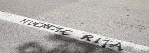 Una sorpresa desagradable es lo que se ha encontrado esta mañana la alcaldesa Rita Barberá al salir de su casa, en el centro de Valencia. «Rita muérete» y «muérete» formaban dos pintadas amenazantes en la franja blanca que separa en la calzada el carril bus del resto de carriles, justo un día después de que pasara por dicho lugar la manifestación convocada por el movimiento 15M.