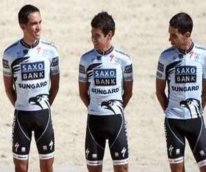 Alberto Contador, junto a Jesús Hernández y Daniel Navarro, durante la presentación de los equipos en el Tour de Francia.