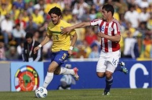 Con el paso de los minutos, los brasileños fueron dominando el encuentro, con una gran jugada en el minuto 18, con una combinación de toques entre Ganso y Jadson que dejaba a Pato ante el meta Justo Villar. Poco después, en el minuto 38, Jadson inauguró el marcador con un chute desde fuera del área.