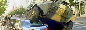 “Estoy cansado de los conductores que estacionan sus coches de lujo en las pistas de ciclistas y peatones. Este tanque es una buena herramienta para resolver el problema de aparcamiento en la línea de fuego”, dijo el alcalde antes de marcharse montado en su bicicleta.