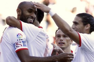 No renunció el conjunto visitante a adelantar sus líneas cuando tuvo el balón en su poder para intentar crearle peligro al meta Javi Navas, pero fue el Sevilla el que más lo buscó y una rápida incursión de Jesús Navas por la derecha, con gran pase a Kanouté, acabó en gol al estar muy certero el malí.