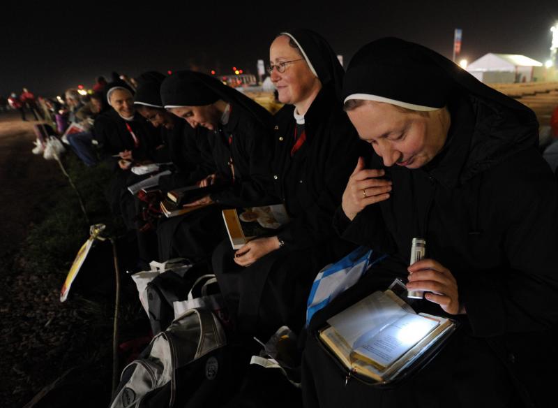 Monjas esperan el inicio de una misa que el Papa Benedicto XVI ofrecerá hoy en la ciudad de Friburgo (Alemania).