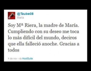 “Soy Mª Riera, la madre de María. Cumpliendo con su deseo me toca lo más difícil del mundo, deciros que ella falleció anoche. Gracias a todos”. Este es el mensaje que apareció en Twitter tras la muerte de una chica después de una larga lucha contra el cáncer.