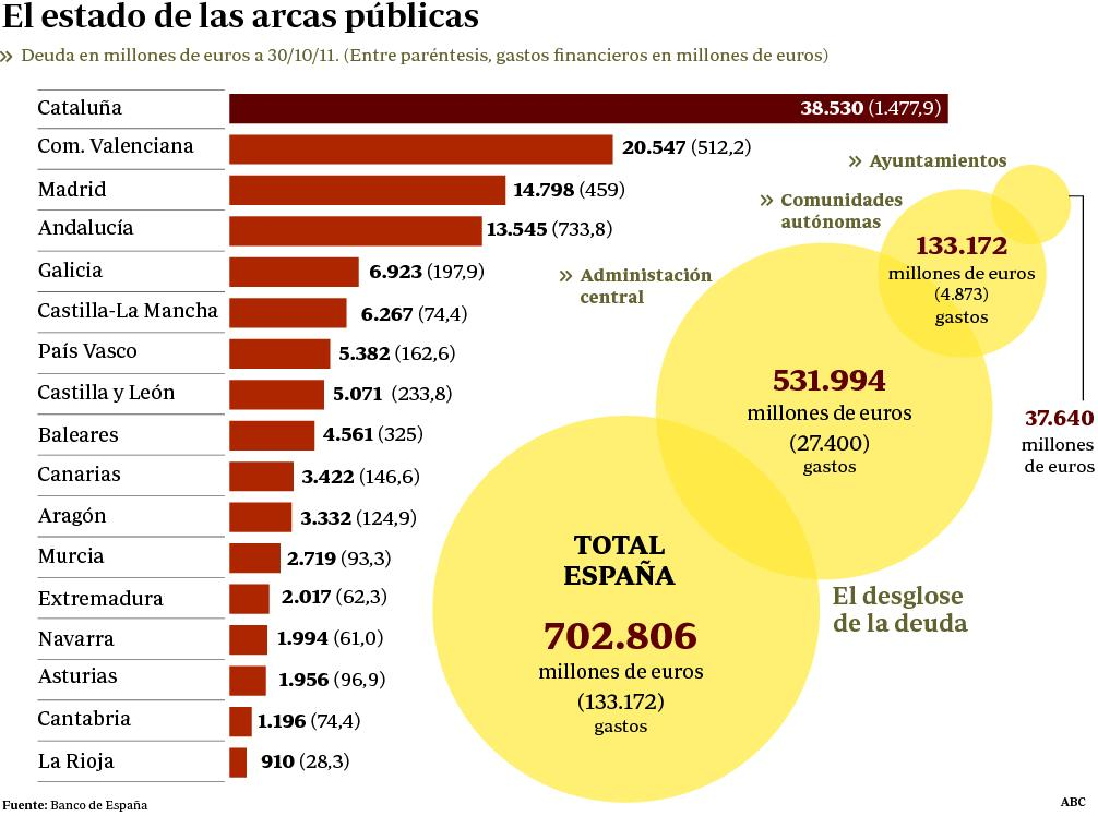 .El agujero autonómico es menor, 133.172 millones de euros a mitad de ejercicio, pero avanza a un ritmo más acelerado. En total las autonomías destinarán en 2011 cerca de 5.000 millones a gastos financieros, trece cada día. Y las entidades locales, que acumulan una deuda superior a los 37.000 millones de euros, pagarán en torno a cinco millones de intereses.