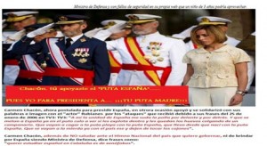 La imagen colgada por los hackers es de la etapa de Chacón como ministra de Defensa a la que acompañaba un rótulo en rojo y amarillo, haciendo un guiño a la bandera nacional, que exclama: “Chacón, tú apoyaste el ‘puta España’, pues yo ahora para presidenta a ¡¡¡ tu puta madre!!!”, haciendo referencia a los insultos que el actor Pepe Rubianes dedicó a una parte de España en TV3 y que Chacón apoyó en varias ocasiones.