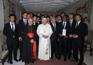 El Atlético de Madrid ha visitado el Vaticano por tercera vez. El equipo de Simeone juega este jueves la Europa League ante la Lazio de Roma, antes la expedición rojiblanca ha asistido a la audiencia general del Papa Benedicto XVI, donde también se encontraba el presidente de la Conferencia Episcopal y Cardenal Arzobispo de Madrid, Antonio María Rouco Varela.