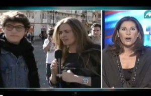 En un momento de la entrevista en directo, que la presentadora del informativo del mediodía de Intereconomía, Pilar García de la Granja, estaba llevando a cabo con uno de los jóvenes que se manifiestan estos días en Valencia, primero se ha dejado de oír la señal sonora que llegaba, poco después se ven bruscos movimientos de la cámara y seguidamente se observa la imagen de la periodista que se asombra de la llegada de alguien.