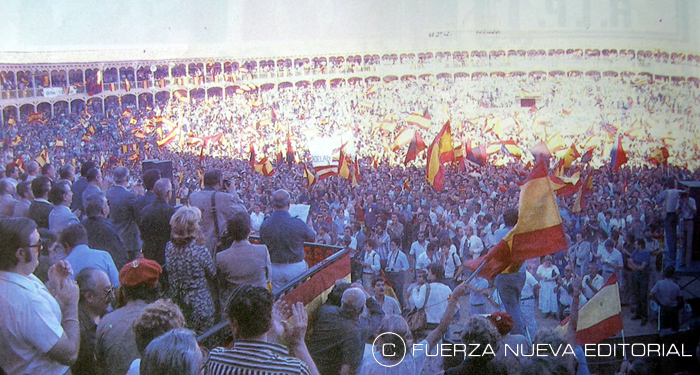 Miles de personas congregadas en la plaza de toros de Las Ventas para escuchar a Blas Piñar, líder de Fuerza Nueva en 1979, año de la imagen.