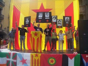 me cago en los cerdos canallas mercenarios de la foto, pretendidos a balcanizar toda la península… sueño con una España unida y justa y cuando veo fotos así, me dan ganas de vomitar…. quien les paga todos esos trapos y los miles de carteles bien impresos que hay por las calles de Cataluña y el Pais Vasco??? ellos?? JA!