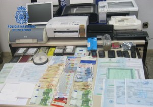En los registros domiciliarios efectuados, en las localidades de La Herradura (Granada) y Benalmádena (Málaga), los agentes se han incautado de maquinaria especializada para falsificar todo tipo de documentos, así como de moneda. En concreto, los investigadores hallaron 3.770 euros en billetes falsos, 144 billetes de 20 euros y 178 billetes de cinco euros, siendo esta la primera vez que se detectan billetes falsos de cinco euros en España.