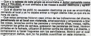 Añade el propietario que el grupo liderado por el actor Willy Toledo agredió a un grupo de personas que allí se encontraban haciéndoles huir del local y arrojándoles las consumiciones. Además, le insultaron a él mismo diciéndole cosas como “eres una mierda” y “o cierras o te vamos a dar”.