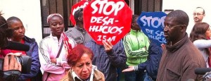 Miembros del grupo Stop Desahucios del movimiento 15M se han concentrado en Granada ante la vivienda de un matrimonio senegalés con cinco hijos pequeños para impedir el desalojo decretado para este jueves por orden judicial y que finalmente no se ha llevado a cabo.