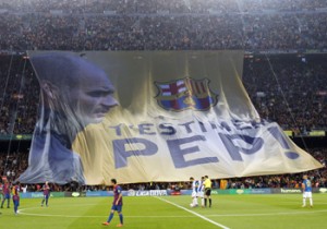 El club dio la posibilidad a los 89.044 espectadores que asistieron al Camp Nou de darle las gracias a Guardiola ya antes del partido, con diversos murales en blanco en los exteriores del estadio para dejar patente los mensajes, y una gran pancarta en la zona de Lateral con el lema ‘T’estimem Pep!’ (‘Te queremos Pep!’). Durante el partido, en el que hondearon miles de banderines con la ‘senyera’ en un lado y una bandera blaugrana en la otra con la inscripción ‘Grecies Pep’, la afición dirigió cánticos de ‘Guardiola, Guardiola’ a su técnico, sobre todo cuando el partido ya estaba decidido y al final del mismo, cuando las banderas volvieron a volar al viento de Barcelona.