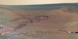La imagen muestra el terreno rojizo alrededor del promontorio donde el explorador de larga duración pasó su invierno marciano más reciente .Esta escena grabada desde la cámara de color del mástil de montaje incluye propios paneles solares del rover y la cubierta en el primer plano, proporcionando una sensación de estar sentado en la parte superior del explorador, y teniendo en la vista.