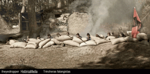 De la táctica y la disciplina en el cometido de todos depende el fracaso o el triunfo de la empresa. Con una rosa en los labiospor entre los peñascales salta un muchacho moreno y espigado, como de dieciséis años, vistiendo pantalón gris y camisa azul, que venía siguiendo a las tropas, sabe Dios desde dónde, con ánimo de incorporarse a ellas.