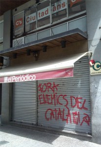 LVL.- La sede de Ciudadanos en Gerona ha sido atacada tras conocerse los resultados electorales. La propia formación lo denunciaba a través de su Twitter a primera hora de la mañana de este 26 de noviembre.