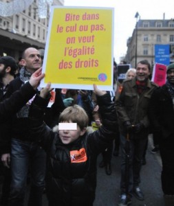 BD.- Esta foto ha sido tomada el domingo 16 de diciembre en París, en el transcurso de una manifestación en favor del matrimonio homosexual. En el cartel que lleva este niño de 8 o 10 años se puede leer: “Con una polla en el culo o no, queremos igualdad de derechos”. Hasta aquí hemos llegado.