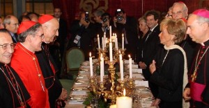 El arzobispo de Barcelona, de rojo, entre los prelados que agasajan a la ex vicepresidenta del Gobierno de Zapatero, María Teresa Fernández de la Vega.