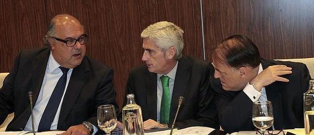 El presidente de la Liga de Fútbol Profesional, Javier Tebas (d), el vicepresidente, Clemente Villaverde (2d) y el secretario general, Carlos del Campo (2i). / Miguel Ángel Molina