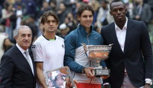 Las peripecias con la raqueta de dos deportistas españoles protagonizan la tarde en París. La grada francesa, dividida entre la perplejidad y el recelo, aplaude pero sin mucho entusiasmo. Hay más tensión que golpes talentosos. Es una final. Las condiciones del partido no son buenas para Nadal: el cielo, repleto de nubes; la temperatura, fría. Incluso llueve a ráfagas, no lo suficiente como parar el duelo. Así sus golpes no son mortales. Pero es así como hace historia. Nada ni nadie le para. Ni siquiera Ferrer, que llegaba a la final sin haber cedido un set y con seis horas menos en pista que su oponente. Rafael Nadal Parera es insaciable.