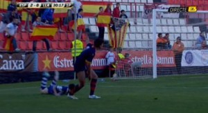 Fue el primer paso hacia la erradicación de cualquier vestigio de españolidad, aunque por aquel entonces todavía se permitían las banderas rojigualdas entre el público. Una de las enseñas que más presencia ha tenido siempre en el estadio Olímpico de Montjuic (rebautizado a Lluis Companys con fines catalanistas) ha sido la española con el anterior escudo en el centro. Pues éstas son ahora retiradas porque, según el club, vulneran sus derechos de propiedad. El argumento no puede ser más chabacano, ya que no comete falta ni delito el portador sino aquel que reproduce y se lucra con la reproducción de símbolos sobre los que no tiene los derechos. Los empleados de seguridad del club tienen ahora la obligación de impedir la entrada de cualquier bandera española y retirar las que se cuelen dentro.