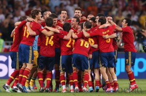 España: Casillas, Arbeloa, Piqué, Ramos, Jordi Alba, Busquets, Pedro, Xavi, Cesc, Iniesta y Torres.
