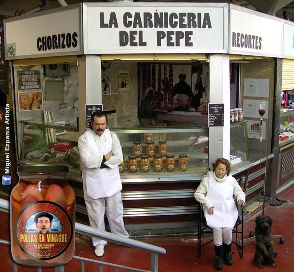 BD.- El artista Miguel Ezpania es un fan de las pollas en vinagre. Pero no así los tenderos del madrileño mercado de la Cebada, menos aún si en la etiqueta de este sabroso manjar aparece la foto del presidente Mariano Rajoy con su rictus más estupefacto, como si le hubieran pillado trabajando para el Gobierno o algo así.