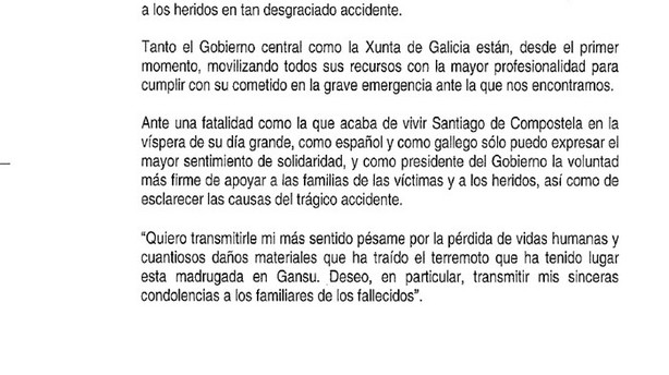 Tras tres párrafos en los que muestra sus condolencias con las víctimas en el que se muestra “consternado por la noticia del descarrilamiento de un tren Alvia en las cercanías de Santiago de Compostela”, en el último párrafo del documento enviado por el palacio de la Moncloa se cuela un párrafo de condolencias a la tragedia de Gansu.