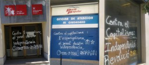 ‘Contra el capitalismo y el españolismo, la juventud decidimos independencia. Ahora o nunca’ es el lema que los radicales han pintado en la persiana y puerta de las sedes del PP y del PSC, respectivamente. Además, en la sucursal de la entidad bancaria han pintado la frase: ‘Contra el capitalismo: independencia y revolución’.