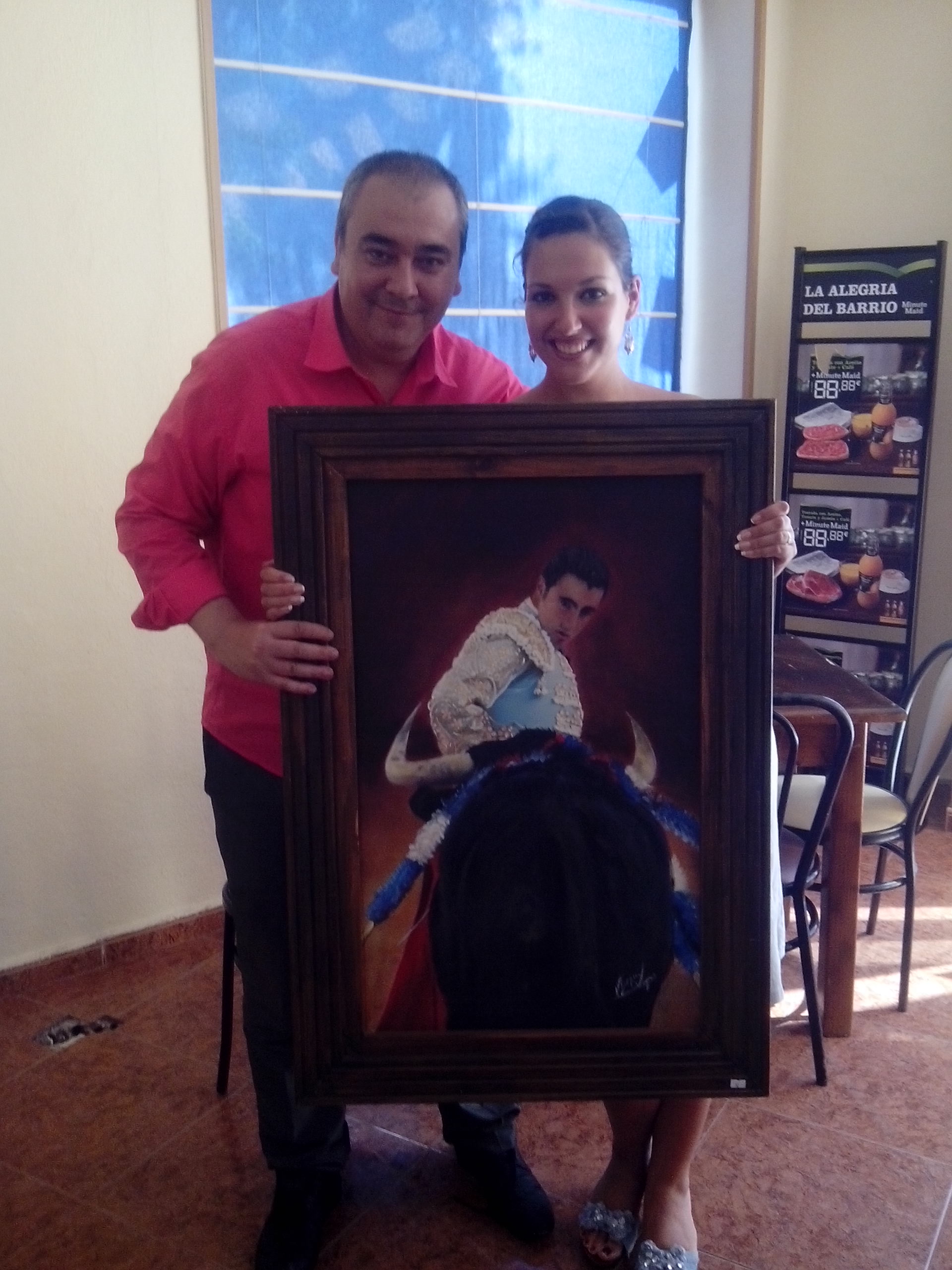 Armando Robles y la jefa de producción de ‘La Ratonera’, Lucía Gálvez, posan con el cuadro del diestro granadino en plena faena de muletas.