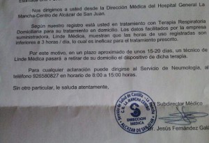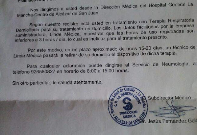 Los castellano-manchegos creían estar ya curados de espanto ante los salvajes recortes que desde que es presidenta María Dolores Cospedal lleva a cabo en la Comunidad. Pero el último “tijeretazo” ha dejado sin aliento, y, sobre todo, sin aire a un grupo de enfermos de terapia respiratoria de la localidad ciudad realeña de Alcázar de San Juan, que viven gracias al oxígeno que tienen en sus casas y a los que han anunciado que en un plazo de “15 o 20 días” les serán retirados los equipos de su domicilio, porque, según la carta enviada por el Servicio de Salud castellano-manchego y que reproduce El Plural, no son pacientes económicamente rentables, ya que la empresa privada Linde Médica, operativa en el sector desde agosto de 2012, ha decidido resolver de forma unilateral que el uso que hacen del mismo es inferior a la prescripción médica.