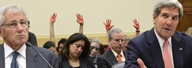 Varios miembros de la asociación Code Pink han mostrado sus manos pintadas de rojo para manifestar su oposición a la intervención militar de EE UU.