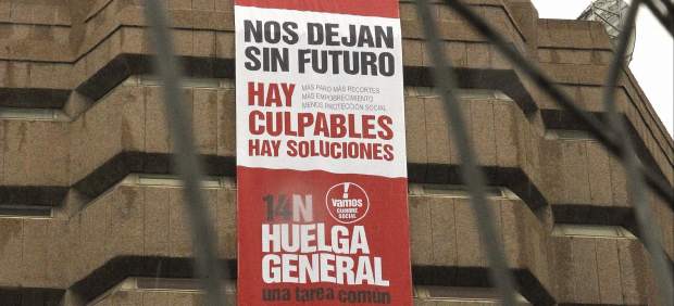 UGT descolgó una pancarta de 15×5 metros en la fachada de su sede situada en Avenida de América número 25, en Madrid, para animar a los ciudadanos a participar en la huelga general del 14 de noviembre.