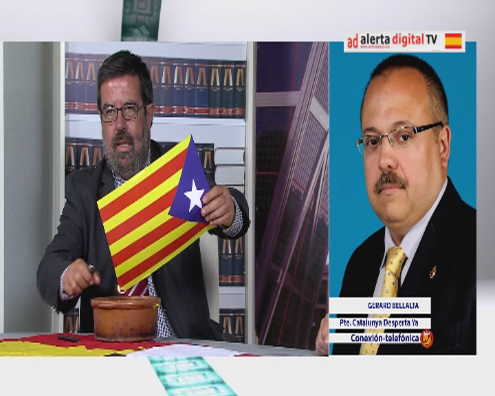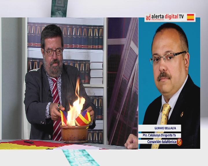 Coincidiendo con la entrevista telefónica al líder del Partit Espanyol de Catalunya (PEC), Gerard Bellalta, el periodista y escritor de origen segoviano tomó una estelada y procedió a prenderle fuego ante las cámaras de Alerta Digital. “La estelada no tiene ningún sentido histórico y es la bandera de un grupo terrorista. Para lo único que sirve y para lo único que es digna es para ser quemada”, subrayó de Diego mientras la enseña de los separatistas era consumida por el fuego. “Se trata de un exorcismo patriótico”, declaró instantes antes. (Pinche aquí para ver el momento de la quema de la estelada)