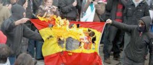 Y como de costumbre los valientes separatistas catalanes quemando la bandera nacional con la cara tapada, ahí se ve el valor de estas ratas y hablan de hacernos frente iros a tomar por culo fantoches si os tapáis la cara para quemar la bandera nacional en caso de conflicto no tendríamos a nadie en frente. Banda de cobardes traidores os cagais al primer disparo banda de inútiles. Algún día tragareis las cenizas de las banderas nacionales que quemáis.