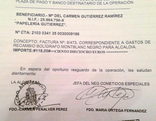 El concepto que reza en dicho documento y que reproduce La Razón, es el siguiente: «Factura número 8/473, correspondiente a gastos de recambio bolígrafo Montblanc negro para Alcaldía».