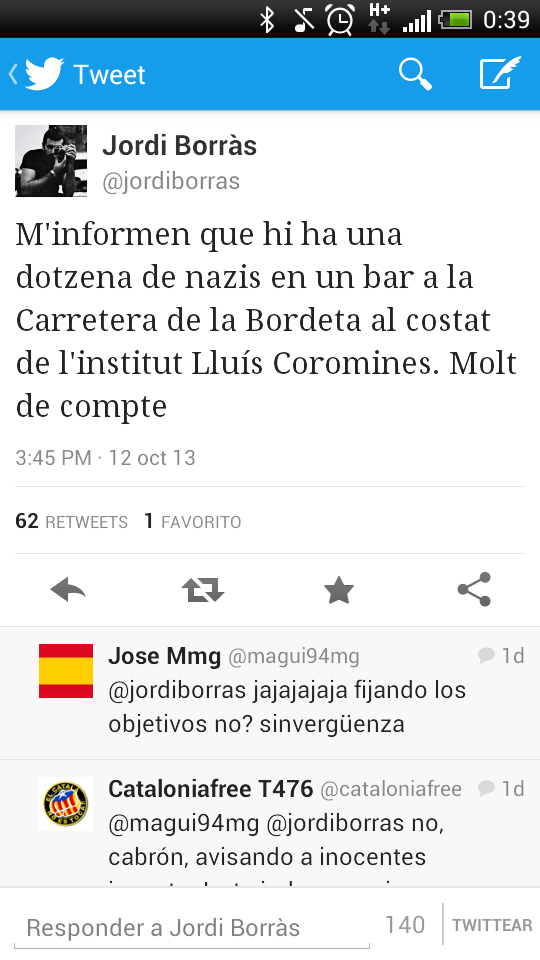 Horas más tarde, el propio Jordi Borrás retuiteaba y marcaba como favorito un mensaje de uno de sus seguidores que venía a justificar la agresión diciendo que “eso pasa cuando va alguien a un lugar a sabiendas que no son bien recibidos”.