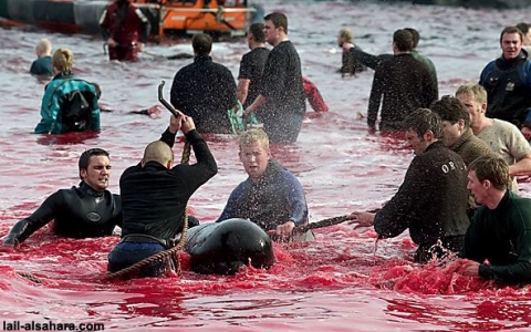 La ceremonia tiene lugar en Dinamarca en primavera cuando los delfines calderones se acercan a las costas, y todo el pueblo se prepara para el “gran día”. Este acto, que se realiza al aire libre y a la vista de todos, se convierte en una fiesta que deja las aguas teñidas de rojo, bañadas de sangre.