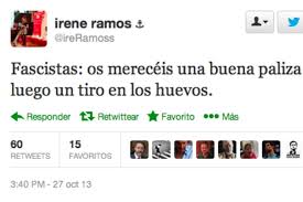 “Fascistas os merecéis una buena paliza y un tiro en los huevos”, escribió la secretaria general de JSE en el madrileño distrito de San Blas, Irene Ramos, en su cuenta de Twitter, a la que este lunes ya no se podía acceder.