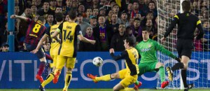 A pesar de tener más el balón, los de Martino apenas podían acercarse todavía a Courtois porque los rojiblancos les enjaulaban al juntar sus líneas y Messi no recibía en condiciones de poder pensar y desequilibrar. La única vez que lo hizo, superó a Miranda, se asoció con Iniesta y el disparo del manchego lo tuvo que salvar Godín, inmenso. A los catalanes les faltaban rapidez en la circulación y movilidad para poder descolocar a una zaga que basculaba con unos automatismos extraordinarios. El portero belga apenas tuvo que parar un cabezazo de Messi bastante lejano y seguir con la mirada un tiro alto de Neymar. Se quejaban los culés de que los rojiblancos les cortaban el ritmo a base de faltas tácticas que les costaron la amarilla a Koke, Gabi y Arda antes del descanso. Brych recibía una presión extraordinaria desde la grada en cada falta y los colchoneros se metían en problemas. Curiosamente, la mejor opción la tuvo de nuevo Villa. Sacó rápido una falta el listo Gabi y el tiro del ‘Guaje’, tras ganarle a Bartra, lo desvió Pinto.