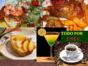 Flipa 2 platos, postre, bebdida y café, menos de 4 euros..y luego te clavan 7 ó 10 EURACOS por un cubata aguado en la discoteca.