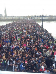 BD.- Imagen tomada en Burdeos el 2 del pasado mes de marzo. A veces hemos hablado de la Gran Sustitución, es decir el proceso de sustitución de las poblaciones blancas europeas por la inmigración/invasión de pueblos no blancos (moros, negros…). Para aquellos que todavía no entienden de lo que se trata o no quieren darse cuenta de lo que eso significa, esta imagen les valdrá más que mil palabras y tal vez les abra los ojos. Se trata de la celebración de una fiesta local llamada Carnaval de las Dos Orillas, que tiene lugar el primer domingo de marzo. En Burdeos, hay que insistir, ya que la exótica muchedumbre del puente podría hacernos pensar que estamos en Kinshasa, Dakar o Adís Abeba. El futuro es hoy. África está aquí. Si Juana de Arco y Napoleón levantaran la cabeza…