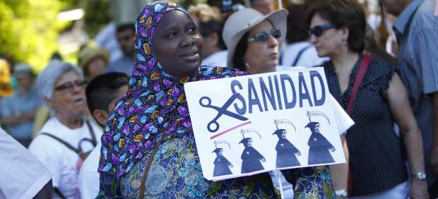 Una mujer inmigrante sostiene una pancarta contra los recortes en la novena ‘marea blanca’ por la sanidad pública en Madrid.