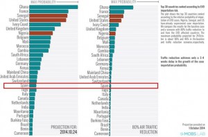 España se sitúa en el puesto 19 entre los 30 países con mayor riesgo de contagio de ébola, según un análisis basado en patrones de desplazamiento y ritmo de contagio. Concretamente, el estudio determina que existe un riesgo del 14% de que se detecte un caso en España, una cifra “relativamente baja” si se compara con los países francófonos, como Bélgica, en donde el riesgo ronda el 40%, de acuerdo con las predicciones.