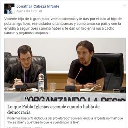 El concejal de Cultura y Fiestas del Ayuntamiento de Paredes de Nava (Palencia), Jonathan Cabeza Infante, publicó este jueves un mensaje en su perfil de Facebook en el que deseaba al líder de Podemos, Pablo Iglesias, que le diesen “un tiro en la nuca”.